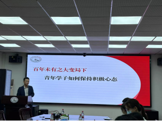 活動(dòng)在雄壯的國歌聲中拉開帷幕。活動(dòng)伊始,王明飛副書記以《百年未有之大變局下青年學(xué)子如何保持積極心態(tài)》為題講授主題黨課。王明飛由“百年未有之大變局下馬院學(xué)子的心態(tài)”入手,結(jié)合社會(huì)熱點(diǎn)案例,深入淺出地講解了當(dāng)前社會(huì)心態(tài)特別是大學(xué)生的社會(huì)心態(tài)及如何調(diào)整等問題,倡導(dǎo)同志們通過廣泛尋求外部支持、結(jié)交摯友、強(qiáng)健體魄和健康飲食等途徑,在復(fù)雜多變的外部環(huán)境下保持積極健康的心態(tài),以之更好地促進(jìn)自身發(fā)展。