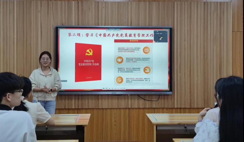 活動伊始,劉孟迪同志向全體黨員匯報了新一屆支委會的工作開展情況,并就支部相關規(guī)章制度進行說明,希望每名黨員同志都能嚴守紀律,遵守制度,做合格黨員。隨后,劉孟迪同志領學《中國共產(chǎn)黨黨員教育管理工作條例》,明晰了黨員、支委會以及黨支部在黨員教育管理過程中的具體要求。她表示,希望此次《條例》的學習,能夠推動支部黨員隊伍建設,提高黨員素質(zhì),促使各位黨員進一步發(fā)揮先鋒模范作用。