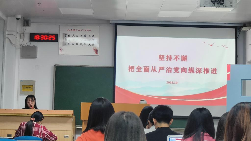 10月17日晚,本次培訓(xùn)班第一講《習(xí)近平總書記關(guān)于全面從嚴治黨的重要講述》于東十二樓309教室開展。主講老師高翔首先強調(diào)了全面從嚴治黨的意義,接著圍繞三個方面生動講解了從嚴治黨的深刻內(nèi)涵,并梳理了黨的十八大以來全面從嚴治黨的輝煌成就。最后,高翔老師帶領(lǐng)班級成員系統(tǒng)地學(xué)習(xí)了二十大報告關(guān)于全面從嚴治黨的周密部署,她指出“全面從嚴治黨是新時代黨的自我革命的偉大實踐”,學(xué)員們應(yīng)當(dāng)深刻把握新時代全面從嚴治黨的豐富內(nèi)容。