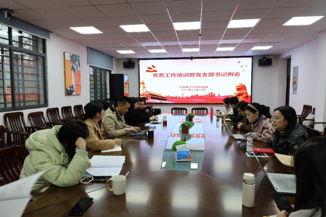 (通訊員:楊夢(mèng)楠)為進(jìn)一步加強(qiáng)學(xué)院黨支部標(biāo)準(zhǔn)化、規(guī)范化建設(shè),厘清黨務(wù)工作思路,提升黨支部書(shū)記履職能力,12月14日下午,馬克思主義學(xué)院在東七樓203會(huì)議室召開(kāi)黨務(wù)工作培訓(xùn)暨黨支部書(shū)記例會(huì)。校黨委組織部黨校辦公室主任王騰飛,學(xué)院各教工黨支部和學(xué)生黨支部書(shū)記及支委們到場(chǎng)參會(huì)。本次會(huì)議由學(xué)院黨委書(shū)記劉雅然主持。