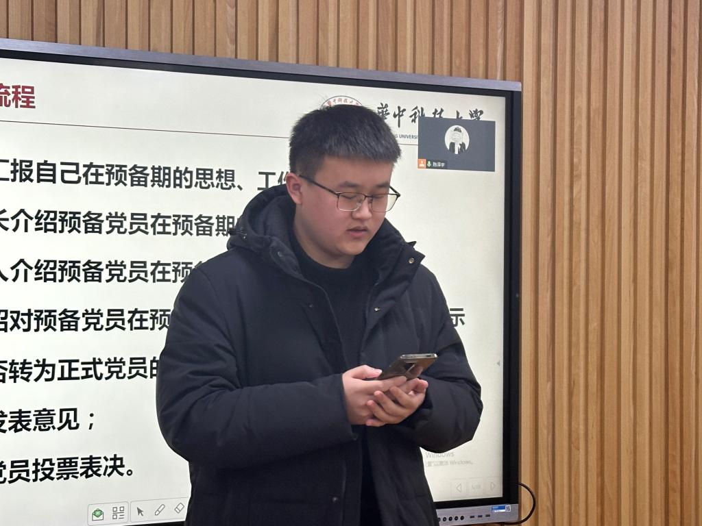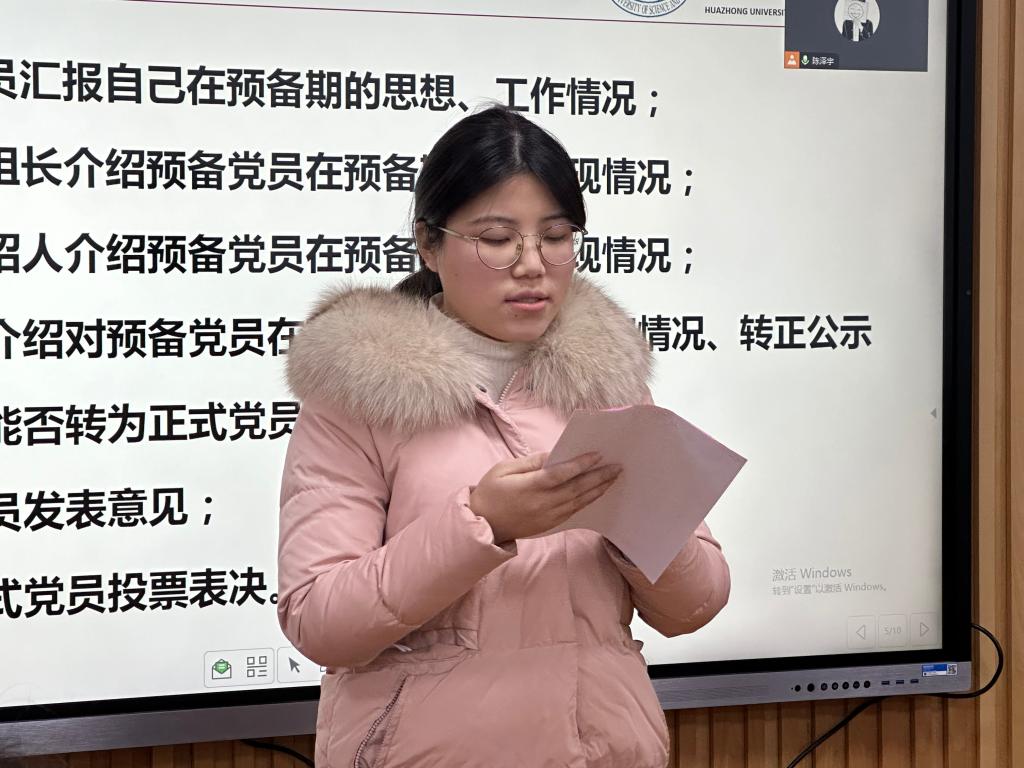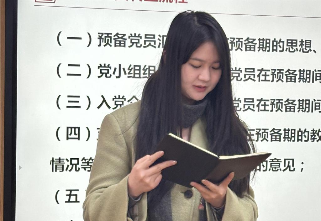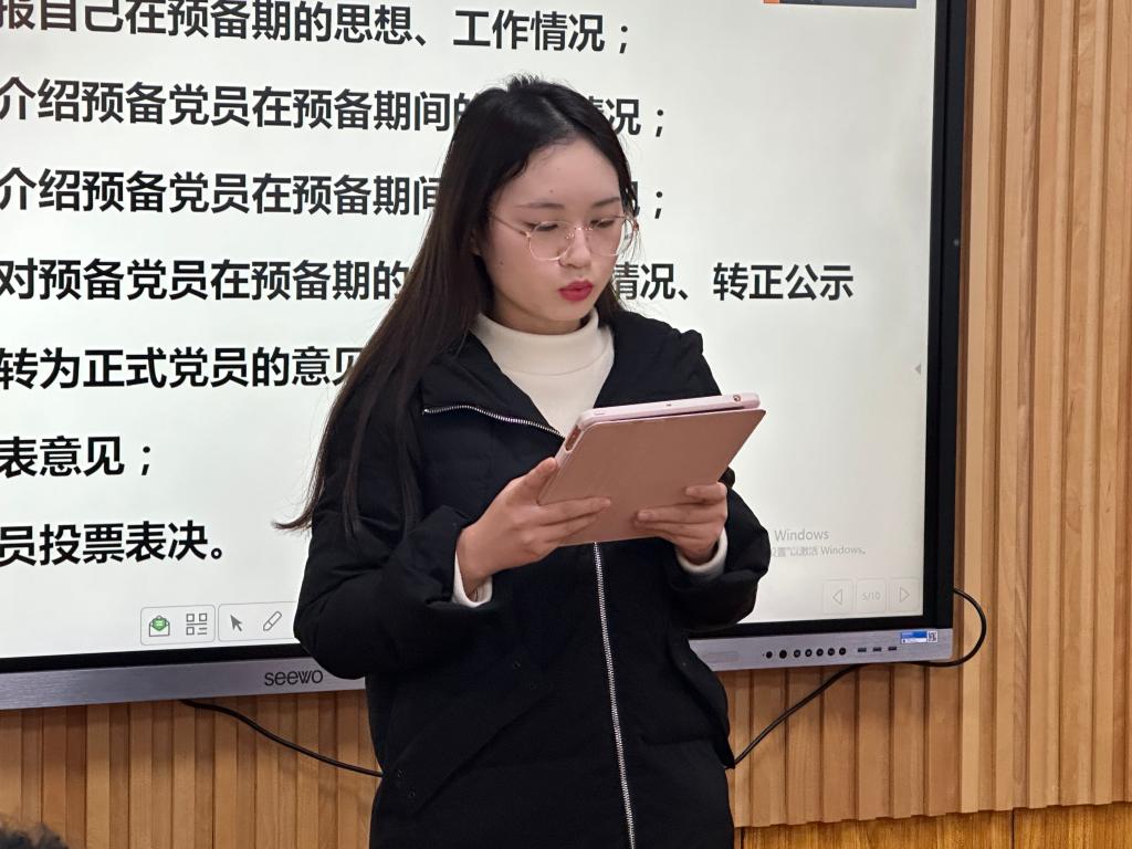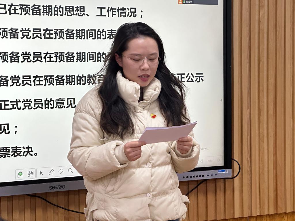 丁穎飛、董芮、劉蕾、徐清揚(yáng)、張會杰、楊夢楠、王天瑞7位同志依次上臺,向黨組織匯報(bào)在預(yù)備期間的思想工作情況,表達(dá)入黨的堅(jiān)定決心。黨小組、入黨介紹人及支委會分別介紹預(yù)備黨員在預(yù)備期間的表現(xiàn)情況,與會黨員發(fā)表意見,對申請人能否按期轉(zhuǎn)正進(jìn)行充分討論。全體與會黨員一致同意7位同志按期轉(zhuǎn)為中共正式黨員。