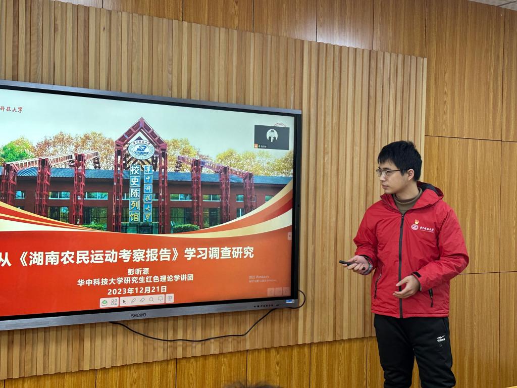 毛澤東同志誕辰130周年到來之際,校研究生紅色理論學(xué)講團(tuán)講師彭昕源以“從《湖南農(nóng)民運(yùn)動考察報(bào)告》學(xué)習(xí)調(diào)查研究”為題講授微黨課。他圍繞《報(bào)告》對調(diào)查研究進(jìn)行解剖,將其分解成預(yù)備籌謀階段、實(shí)施調(diào)查階段、整合研究三個階段,對如何進(jìn)行調(diào)查研究進(jìn)行深入闡釋,并對方法論的形成過程作詳細(xì)講解。