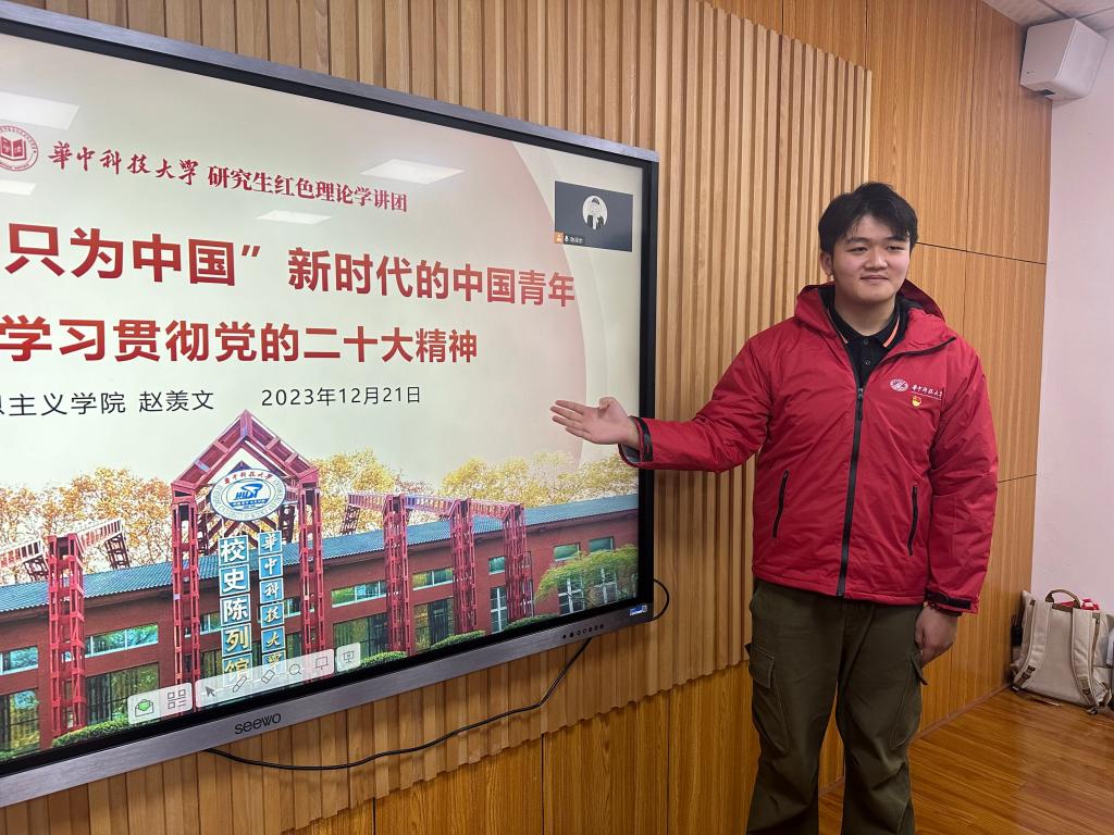 校研究生紅色理論學(xué)講團(tuán)講師趙羨文以“‘清澈的愛 只為中國’新時代的中國青年——學(xué)習(xí)貫徹黨的二十大精神”為題,從新時代中國青年的時代定位、時代風(fēng)貌、使命擔(dān)當(dāng)三個維度,講述總書記對新時代中國青年的殷殷囑托,同大家一起領(lǐng)略感悟新時代中國青年青春風(fēng)貌和使命擔(dān)當(dāng)。他指出,當(dāng)代青年生逢盛世、重任在肩,理應(yīng)展現(xiàn)勇挑重?fù)?dān)、堪當(dāng)大任的時代風(fēng)貌,奮發(fā)踐行“請黨放心,強(qiáng)國有我”的青春誓言。