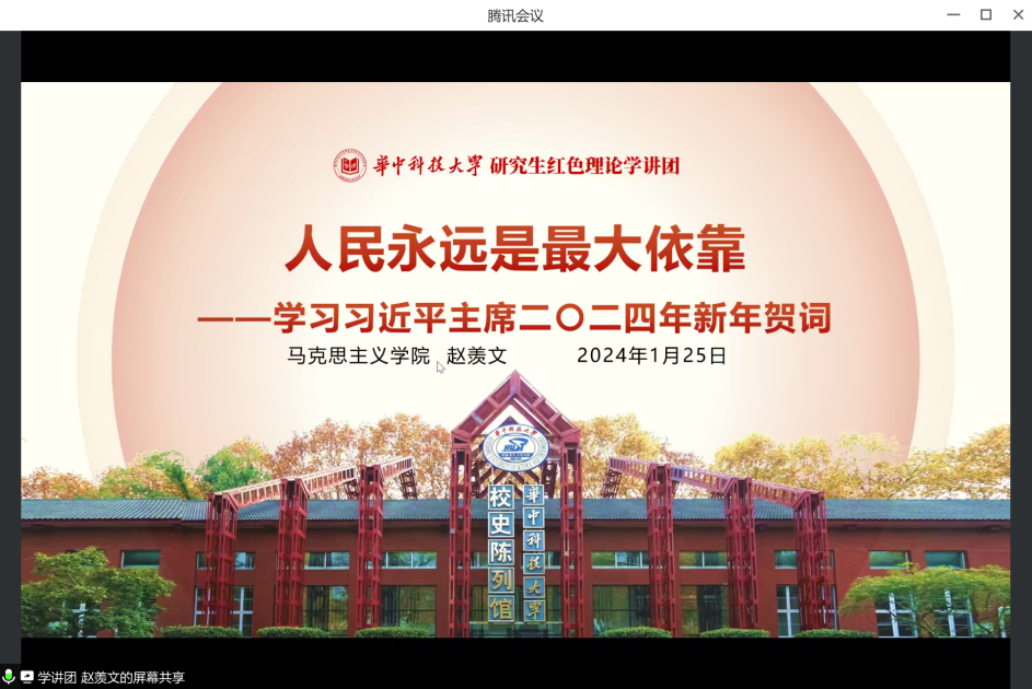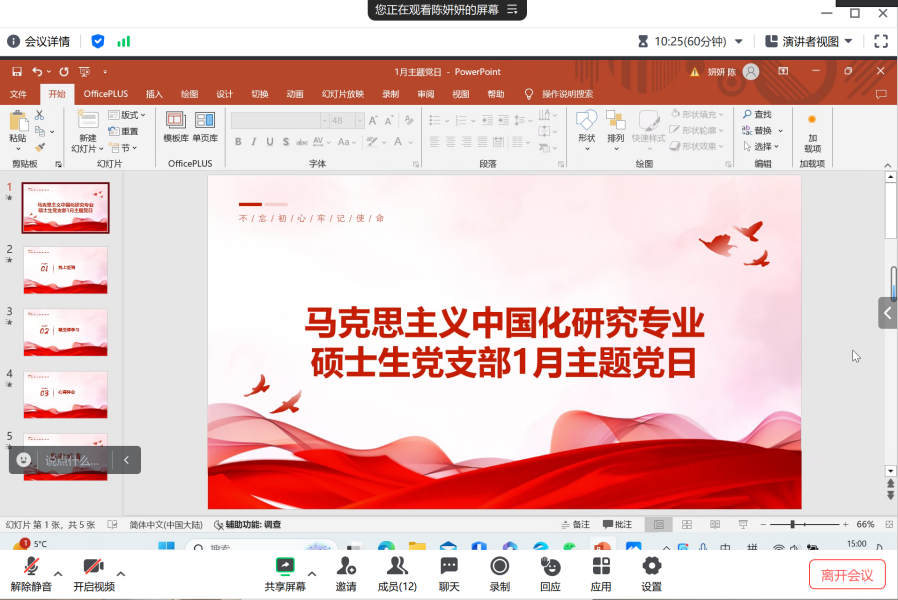 (通訊員:趙姍琳)為強(qiáng)化黨員使命擔(dān)當(dāng),提升支部組織活力,促進(jìn)黨員間的交流與合作,1月25日,馬克思主義中國化研究專業(yè)碩士生黨支部于線上開展一月黨日活動,黨支部成員參會進(jìn)行理論學(xué)習(xí),會議由黨支部副書記陳妍妍同志主持。
