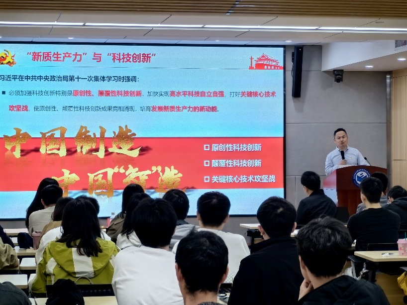 翟天佑老師圍繞“什么是新質(zhì)生產(chǎn)力”“新質(zhì)生產(chǎn)力與科技創(chuàng)新的關(guān)系”“新時(shí)代背景下我們應(yīng)該如何做”三方面展開分享,并強(qiáng)調(diào)科技創(chuàng)新是孕育新質(zhì)生產(chǎn)力的核心動力。面對新時(shí)代的機(jī)遇與挑戰(zhàn),翟老師對廣大青年提出了明確的行動倡議,鼓勵(lì)在座的黨員同志要胸懷壯志,向高而攀,勇于攀登科學(xué)技術(shù)高峰,始終保持對前沿知識的探索熱情;向新而進(jìn),敢于突破傳統(tǒng)思維束縛,積極參與創(chuàng)新創(chuàng)業(yè)實(shí)踐,成為推動新質(zhì)生產(chǎn)力發(fā)展的生力軍;向?qū)嵍鵀椋_踏實(shí)地,將理論知識轉(zhuǎn)化為解決實(shí)際問題的能力,以實(shí)際行動踐行創(chuàng)新驅(qū)動發(fā)展戰(zhàn)略。