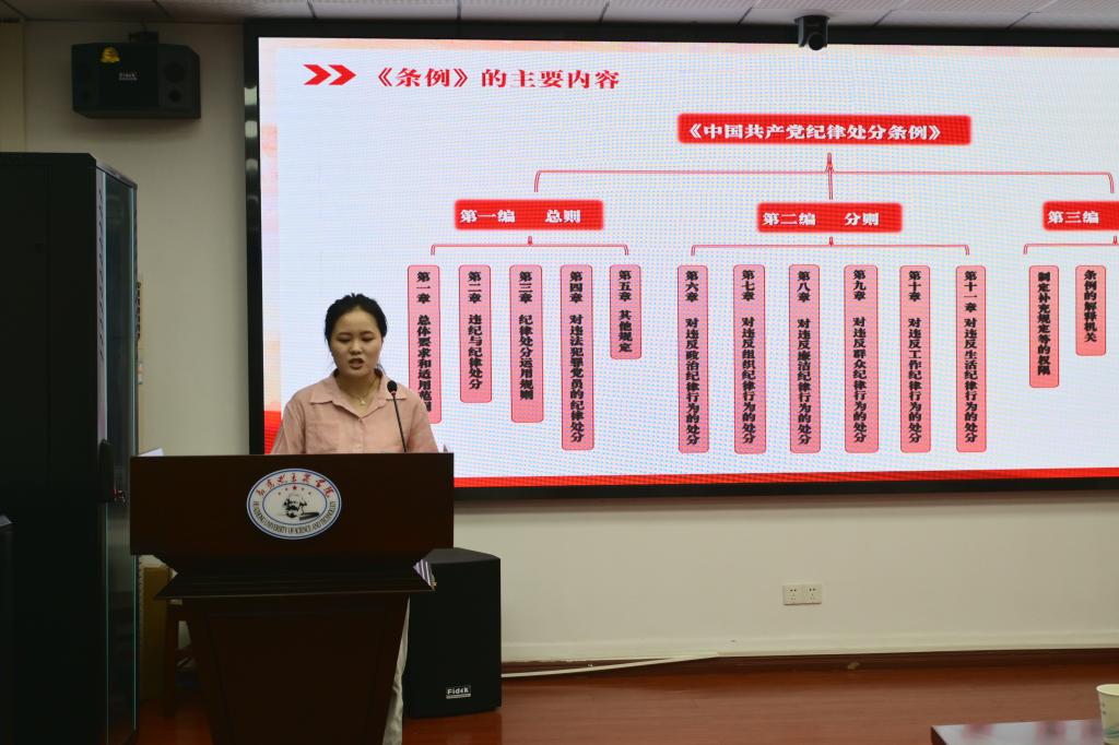 “加強(qiáng)紀(jì)律性,革命無不勝”。紀(jì)律嚴(yán)明是黨的光榮傳統(tǒng)和獨(dú)特優(yōu)勢(shì),正是靠著嚴(yán)明的紀(jì)律和規(guī)矩,中國(guó)共產(chǎn)黨才能不斷取得革命、建設(shè)和改革事業(yè)的偉大勝利。集體學(xué)習(xí)中,支部宣傳委員楊培妍以《學(xué)黨紀(jì),強(qiáng)黨性》為題展開黨課講授,為與會(huì)黨員同志解讀《中國(guó)共產(chǎn)黨紀(jì)律處分條例》(下文簡(jiǎn)稱《條例》),從適用范圍、歷次修訂情況、主要內(nèi)容展開,系統(tǒng)介紹《條例》的整體概況,為支部同志會(huì)后的自主學(xué)習(xí)奠定基礎(chǔ)。隨后,楊培妍就《條例》內(nèi)容逐章解讀,號(hào)召支部黨員同志“要堅(jiān)持提高站位學(xué)、逐章逐條學(xué)、帶著使命學(xué)、聯(lián)系實(shí)際學(xué)”。在學(xué)習(xí)現(xiàn)場(chǎng),支部黨員同志認(rèn)真聽講,細(xì)致批注,積極深化對(duì)《條例》理解和掌握。