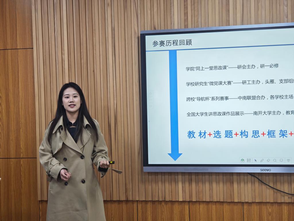 理論學(xué)習(xí)結(jié)束,為幫助支部成員更好地準(zhǔn)備即將到來的“同上一堂思政課”授課大賽,支部邀請(qǐng)2022屆授課大賽的獲獎(jiǎng)選手劉孟迪同志進(jìn)行經(jīng)驗(yàn)分享。她先就比賽參賽歷程進(jìn)行說明,后從案例選取、回歸原典、現(xiàn)實(shí)素材、輔助技能、教學(xué)姿態(tài)等不同角度給出了詳盡的建議,并為大家答疑解惑。