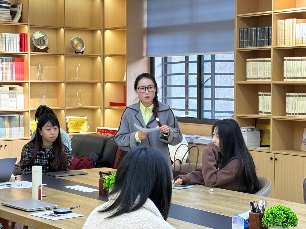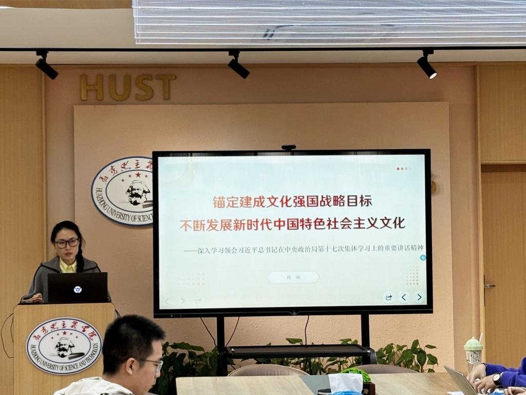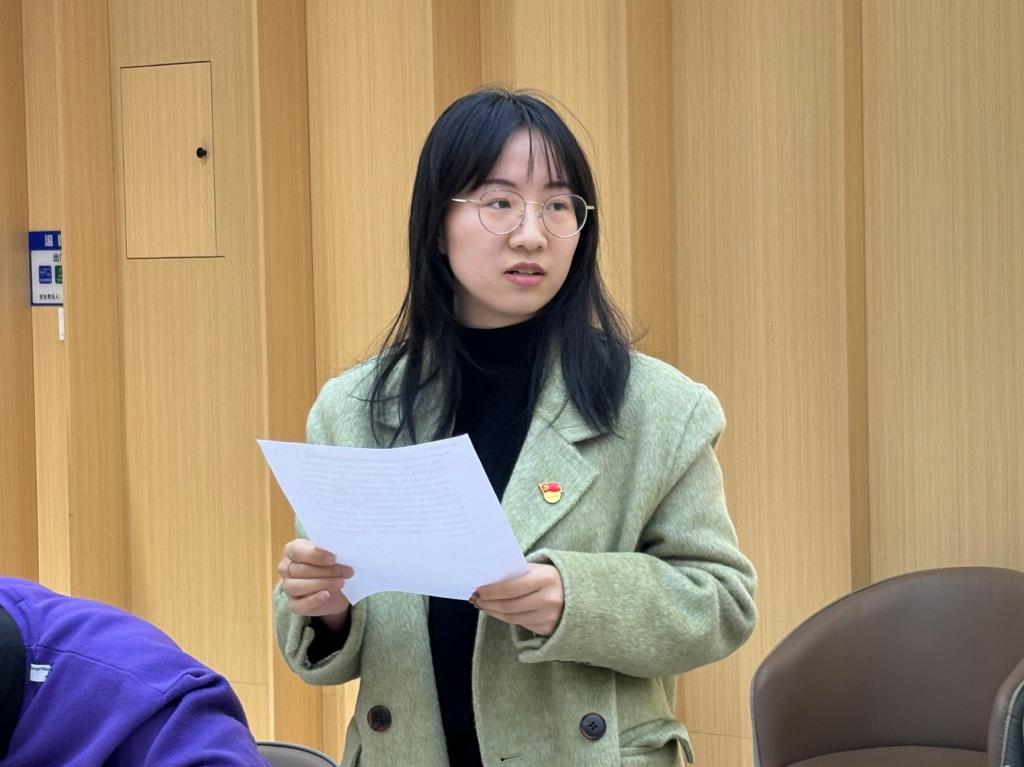 “理論集體學”環(huán)節(jié),第一黨小組預備黨員陳碩以《錨定建成文化強國戰(zhàn)略目標,不斷發(fā)展新時代中國特色社會主義文化》為題,帶領全體支部成員進行理論學習。首先,她回顧了一年來習近平文化思想的實踐經(jīng)驗,指出習近平文化思想在指引文化發(fā)展新方向、開創(chuàng)文化發(fā)展新局面、繪就文化改革新圖景等方面發(fā)揮的積極作用。隨后,她帶領支部成員學習領會習近平總書記在中央政治局第十七次集體學習時的重要講話精神,深入闡述了建設文化強國是全黨全社會的共同任務。