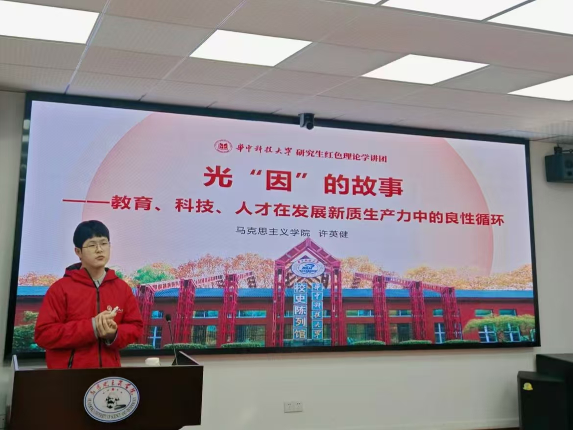 活動(dòng)伊始,研究生紅色理論學(xué)講團(tuán)講師許英健為大家做題為《光因的故事:教育、科技、人才在發(fā)展新質(zhì)生產(chǎn)力中的良性循環(huán)》的精彩宣講。許英健以深入淺出的方式,結(jié)合生動(dòng)的案例,全面剖析了教育、科技、人才在新質(zhì)生產(chǎn)力發(fā)展中的核心作用,使同學(xué)們對(duì)科教興國(guó)戰(zhàn)略、人才強(qiáng)國(guó)戰(zhàn)略有了更加深刻的認(rèn)識(shí)。他強(qiáng)調(diào),強(qiáng)國(guó)建設(shè)、民族復(fù)興的接力棒,歷史地落在我們這一代人身上,我們必須將思想和行動(dòng)統(tǒng)一到黨中央的決策部署上,為實(shí)現(xiàn)中國(guó)式現(xiàn)代化貢獻(xiàn)自己的力量。