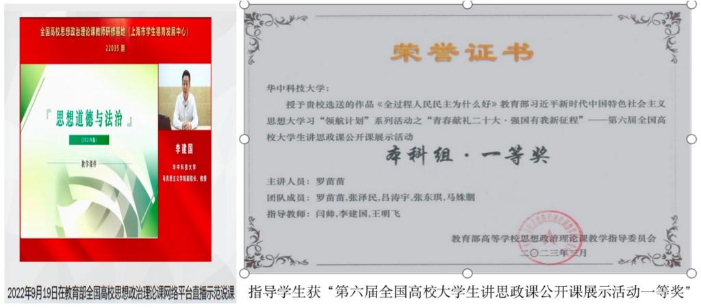 在課程建設(shè)過(guò)程中,本課程入選教育部首批全國(guó)20所高校思想政治理論課“擇優(yōu)推廣計(jì)劃”,相關(guān)成果被《焦點(diǎn)訪談》、人民網(wǎng)、《新華社內(nèi)參》《中國(guó)教育報(bào)》《湖北教育簡(jiǎn)報(bào)》《華中科技大學(xué)校報(bào)》等廣泛報(bào)道。課程教學(xué)團(tuán)隊(duì)針對(duì)不同時(shí)期“德法”課建設(shè)的具體實(shí)際提出相應(yīng)的教學(xué)理念,并取得實(shí)效。為破解傳統(tǒng)線下思政課的“獨(dú)白式”課堂教學(xué)現(xiàn)象,課程組提出互動(dòng)教學(xué)理念,總結(jié)出涵蓋知、情、意三個(gè)維度的26種互動(dòng)教學(xué)方法,并將其應(yīng)用于線下課堂實(shí)踐,課程先后被評(píng)為省級(jí)精品課程(2010年)、湖北省教學(xué)成果一等獎(jiǎng)(2013年)、學(xué)校首批責(zé)任教授課程(2014年)。為滿足“00后”大學(xué)生的多元化學(xué)習(xí)需求,課程組在互動(dòng)教學(xué)基礎(chǔ)上提出差異化教學(xué)理念并將其付諸線下教學(xué)實(shí)踐。從學(xué)生——方法——案例——實(shí)踐——教師“五位一體”精準(zhǔn)匹配,因材施教,促使課程先后被評(píng)為省級(jí)線下一流課程(2021年)、學(xué)校第二批責(zé)任教授課程(2023年)。團(tuán)隊(duì)成員多次參加集體備課會(huì)并進(jìn)行教學(xué)展示,指導(dǎo)學(xué)生獲“第六屆全國(guó)高校大學(xué)生講思政課公開(kāi)課展示活動(dòng)一等獎(jiǎng)作品展示”。