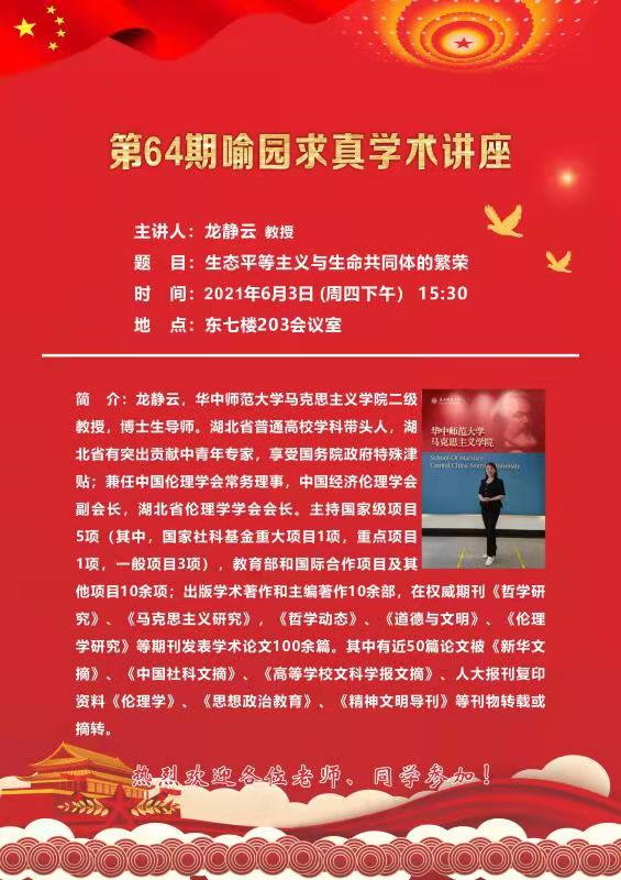 學(xué)術(shù)報告通知:由黨建研究所和馬克思主義中國化研究所聯(lián)合承辦的第64期喻園求真學(xué)術(shù)講座于6月3日(本周四)15:30在學(xué)院203大會議室舉行,歡迎大家參加。