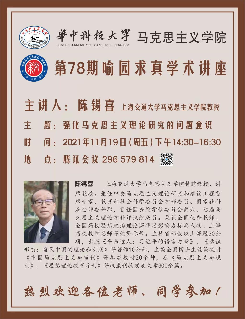 陳錫喜,上海交通大學(xué)馬克思主義學(xué)院特聘教授。兼任中央馬克思主義理論研究和建設(shè)工程首席專家、教育部社會科學(xué)委員會學(xué)部委員、國家社科基金評委等職,曾任國務(wù)院學(xué)位委員會第六、七屆馬克思主義理論學(xué)科評議組成員。榮獲全國優(yōu)秀教師、全國高校思想政治理論課年度影響力標(biāo)兵人物、上海高校教學(xué)名師等榮譽稱號。主持省部級以上課題30余項,出版《平易近人:習(xí)近平的語言力量》、《意識形態(tài):當(dāng)代中國的理論和實踐》等著作10余部,主編全國博士生統(tǒng)編教材《中國馬克思主義與當(dāng)代》等各類教材20余種,在《馬克思主義與現(xiàn)實》、《思想理論教育導(dǎo)刊》等權(quán)威刊物發(fā)表文章300余篇。