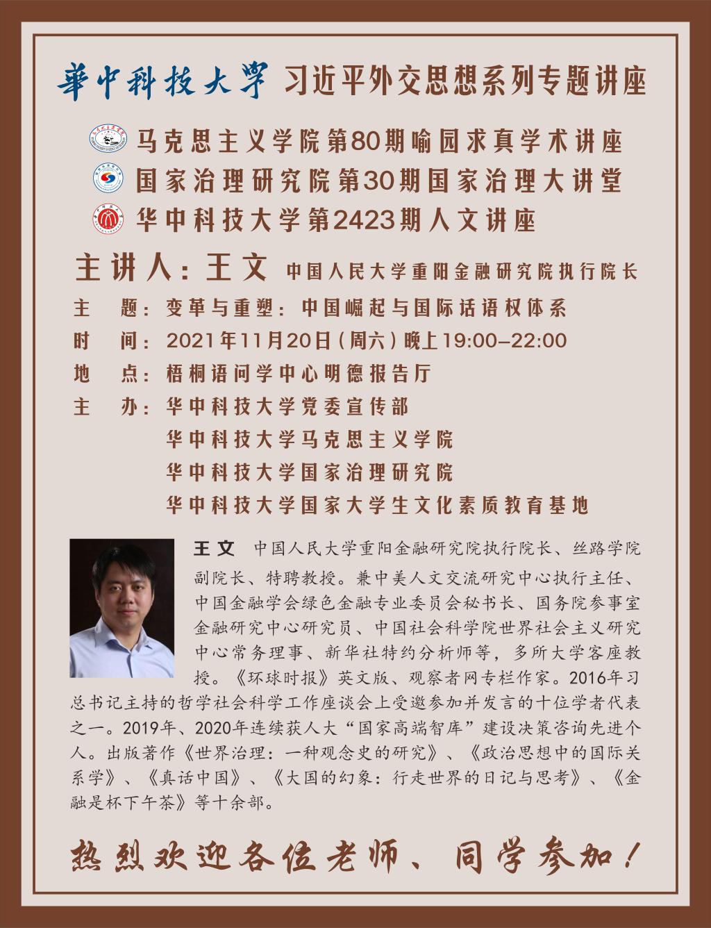 王文,中國人民大學重陽金融研究院執(zhí)行院長、絲路學院副院長、特聘教授。兼中美人文交流研究中心執(zhí)行主任、中國金融學會綠色金融專業(yè)委員會秘書長、國務院參事室金融研究中心研究員、中國社會科學院世界社會主義研究中心常務理事、新華社特約分析師等,多所大學客座教授。《環(huán)球時報》英文版、觀察者網(wǎng)專欄作家。2016年習總書記主持的哲學社會科學工作座談會上受邀參加并發(fā)言的十位學者代表之一。2019年、2020年連續(xù)獲人大“國家高端智庫”建設決策咨詢先進個人。出版著作《世界治理:一種觀念史的研究》、《政治思想中的國際關系學》、《真話中國》、《大國的幻象:行走世界的日記與思考》、《金融是杯下午茶》等十余部。