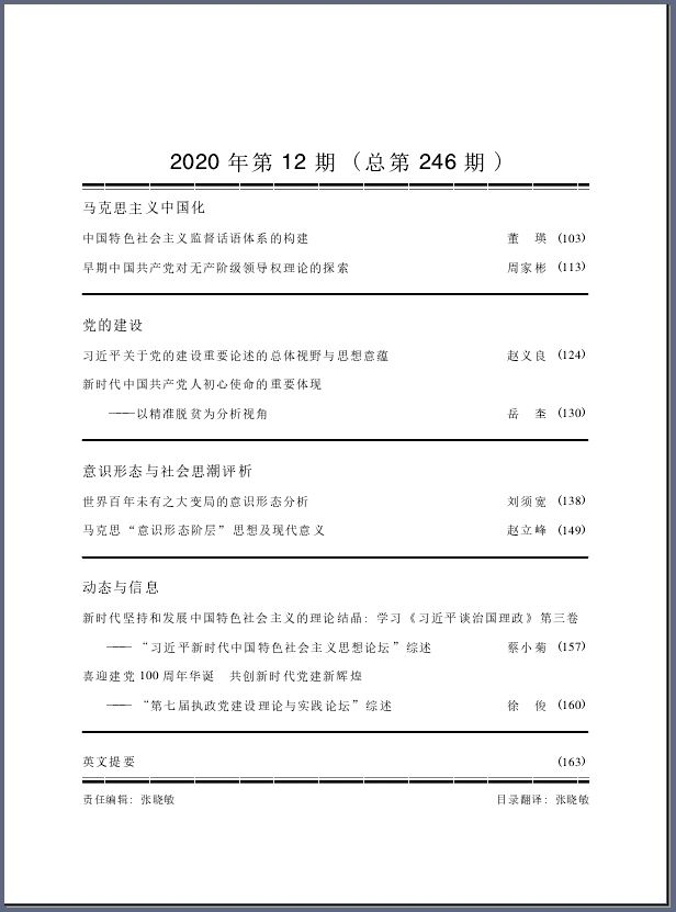 《馬克思主義研究》2020年第12期刊發(fā)我院岳奎教授的學(xué)術(shù)論文《新時代中國共產(chǎn)黨人初心使命的重要體現(xiàn)——以精準(zhǔn)脫貧為分析視角》。該文認為:消除貧困自古以來就是人類夢寐以求的理想,是各國人民追求幸福生活的基本權(quán)利。在人類發(fā)展歷史上,貧困問題一直是困擾世界各國的重大挑戰(zhàn)和未竟難題。作為馬克思主義的忠誠繼承者,中國共產(chǎn)黨從成立之初就堅持無產(chǎn)階級的歷史使命和共產(chǎn)主義遠大理想,把為中國人民謀幸福,為中華民族謀復(fù)興 ( 簡稱 “兩為”) 作為自己的初心和使命。