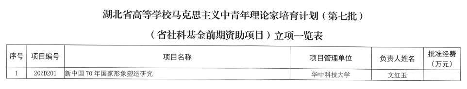 我院文紅玉教授《新中國70年國家形象塑造研究》入選湖北省高等學校馬克思主義中青年理論家培育計劃(第七批)(省社科基金前期資助項目)。