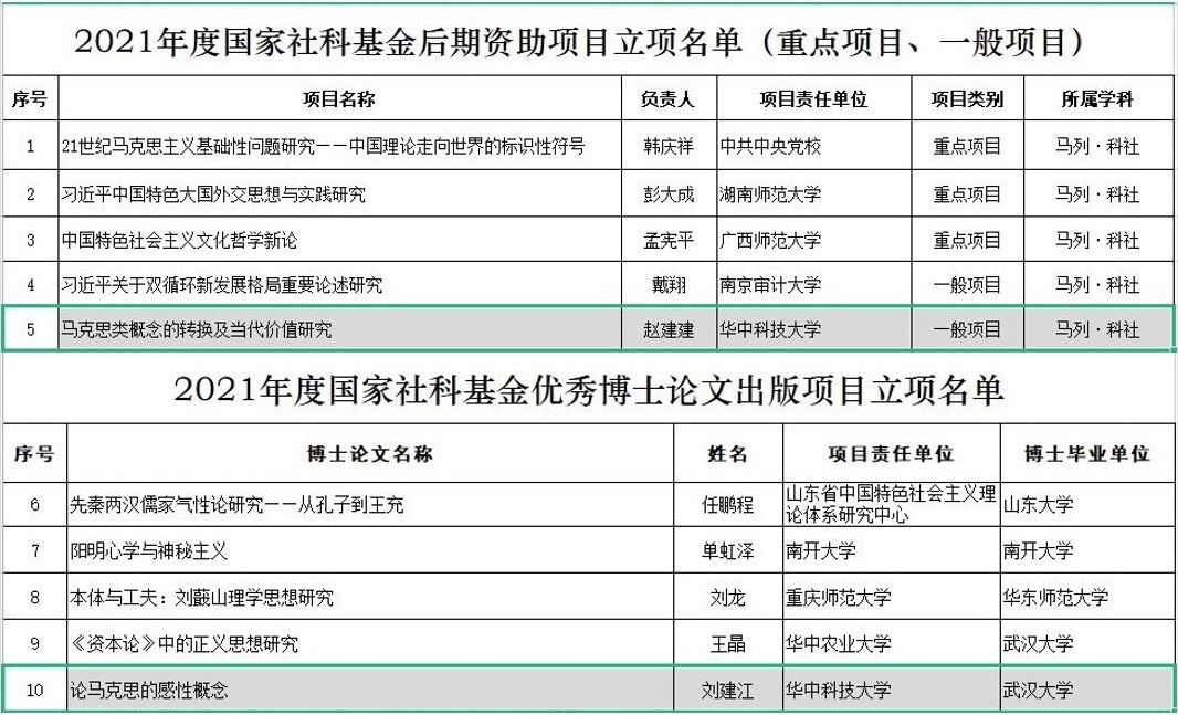 10月8日,全國(guó)哲學(xué)社會(huì)科學(xué)工作辦公室公示2021年度國(guó)家社科基金后期資助暨優(yōu)秀博士論文出版項(xiàng)目立項(xiàng)名單,我院青年教師趙建建申報(bào)的《馬克思類概念的轉(zhuǎn)換及當(dāng)代價(jià)值研究》獲后期資助項(xiàng)目立項(xiàng),青年教師劉建江申報(bào)的《論馬克思的感性概念》獲優(yōu)秀博士論文出版項(xiàng)目立項(xiàng)。