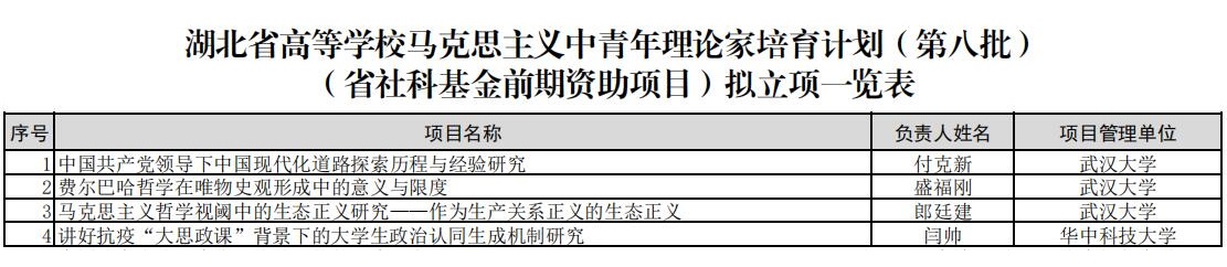近日獲悉,我院閆帥副教授入圍湖北省高等學(xué)校馬克思主義中青年理論家培育計(jì)劃(第八批),他申報(bào)的《講好抗疫“大思政課”背景下的大學(xué)生政治認(rèn)同生成機(jī)制研究》獲批湖北省社科基金前期資助項(xiàng)目。