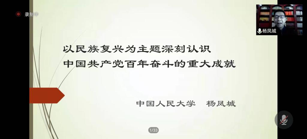 12月30日下午,第86期喻園求真學(xué)術(shù)講座于線上順利舉辦,中國人民大學(xué)馬克思主義學(xué)院楊鳳城教授應(yīng)邀作了題為“以民族復(fù)興為主題深刻認(rèn)識中國共產(chǎn)黨百年奮斗的重大成就”的學(xué)術(shù)講座。馬克思主義學(xué)院教師代表、研究生在東七樓207會議室集中聆聽,來自全國各地的數(shù)百名師生通過線上方式參與講座,學(xué)院黨委書記李小紅主持本次講座。