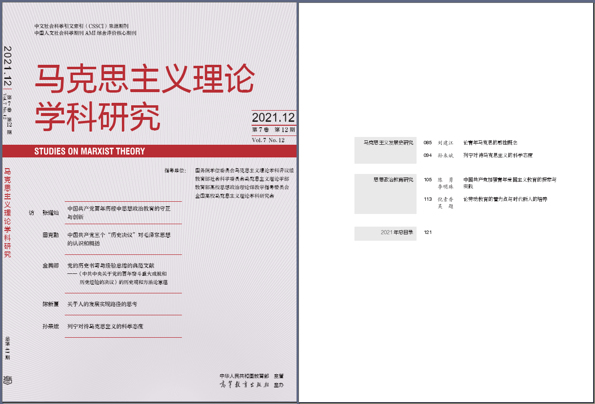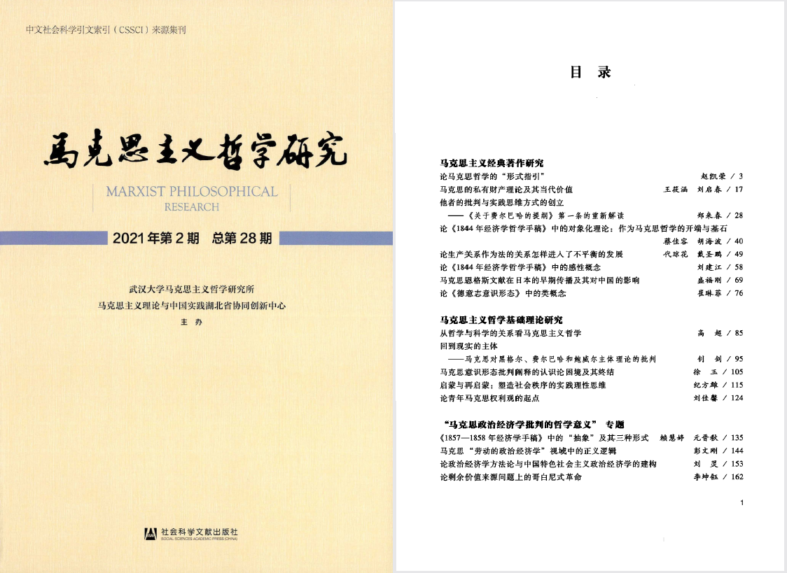 《馬克思主義理論學(xué)科研究》2021年第12期刊發(fā)了劉建江老師的學(xué)術(shù)論文《論青年馬克思的感性概念》,該文從感性存在與對(duì)象性活動(dòng)、感性意識(shí)與感性需要、感性異化與感性解放這三個(gè)方面出發(fā),闡釋了青年馬克思對(duì)感性概念的基本規(guī)定。通過(guò)對(duì)感性概念的重新審思,青年馬克思在存在論的基礎(chǔ)上實(shí)現(xiàn)了對(duì)費(fèi)爾巴哈哲學(xué)和黑格爾哲學(xué)的雙重批判,闡明了實(shí)踐范疇的理論特質(zhì)和現(xiàn)實(shí)指向,從根本上同一切舊哲學(xué)劃開(kāi),實(shí)現(xiàn)了哲學(xué)思想的重要轉(zhuǎn)變。據(jù)悉,《馬克思主義理論學(xué)科研究》由高等教育出版社主辦,是哲學(xué)和人文社會(huì)科學(xué)類(lèi)的B類(lèi)權(quán)威期刊。