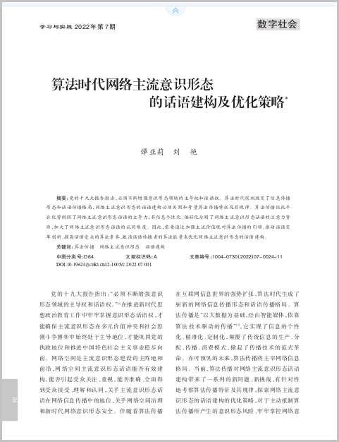 《學(xué)習(xí)與實(shí)踐》2022年第7期刊發(fā)了我院譚亞莉教授、劉艷博士生的學(xué)術(shù)論文《算法時(shí)代網(wǎng)絡(luò)主流意識(shí)形態(tài)的話語(yǔ)建構(gòu)及優(yōu)化策略》。該文認(rèn)為算法時(shí)代深刻改變了網(wǎng)絡(luò)空間的信息傳播形態(tài)和話語(yǔ)傳播格局,網(wǎng)絡(luò)主流意識(shí)形態(tài)的話語(yǔ)建構(gòu)必須關(guān)照和考量算法傳播的影響及其因應(yīng)策略。文章從考察算法傳播與網(wǎng)絡(luò)主流意識(shí)形態(tài)的話語(yǔ)建構(gòu)之間的互動(dòng)關(guān)系著手,進(jìn)行了算法傳播的基本邏輯規(guī)則、對(duì)網(wǎng)絡(luò)主流意識(shí)形態(tài)話語(yǔ)建構(gòu)的擬態(tài)環(huán)境重塑的規(guī)律探討,在充分把握本質(zhì)與規(guī)律的基礎(chǔ)上,我們發(fā)現(xiàn)可以反向“馴化”算法傳播為我所用,為網(wǎng)絡(luò)主流意識(shí)形態(tài)的話語(yǔ)建構(gòu)搭載技術(shù)快車。接下來(lái)從算法傳播的三大獨(dú)特性特征分析其對(duì)網(wǎng)絡(luò)主流意識(shí)形態(tài)話語(yǔ)建構(gòu)帶來(lái)的風(fēng)險(xiǎn)與挑戰(zhàn):算法傳播依托平臺(tái)優(yōu)勢(shì),削弱了網(wǎng)絡(luò)主流意識(shí)形態(tài)話語(yǔ)的主導(dǎo)力;算法傳播的信息個(gè)性化、偏好化,分割了網(wǎng)絡(luò)主流意識(shí)形態(tài)話語(yǔ)的注意力資源;算法傳播遮蔽了受眾主體性和價(jià)值判斷能力,加大了網(wǎng)絡(luò)主流意識(shí)形態(tài)話語(yǔ)的認(rèn)同難度。最后從重塑生態(tài)、爭(zhēng)奪注意力、識(shí)別接納、利用超越四個(gè)層面為算法傳播背景下網(wǎng)絡(luò)主流意識(shí)形態(tài)的話語(yǔ)建構(gòu)提出了優(yōu)化策略。