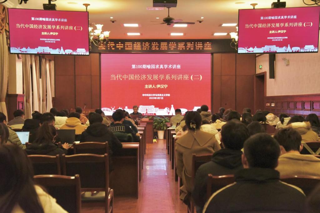 3月1日晚,第100期喻園求真學(xué)術(shù)講座在華中科技大學(xué)梧桐語問道廳成功舉辦。湖北省委原常委、省委宣傳部原部長、全國哲學(xué)社會科學(xué)規(guī)劃領(lǐng)導(dǎo)小組原副組長尹漢寧應(yīng)邀為我院師生作題為《當(dāng)代中國經(jīng)濟(jì)發(fā)展學(xué)》的學(xué)術(shù)講座。湖北省社科聯(lián)黨組書記、常務(wù)副主席喻立平,馬克思主義學(xué)院黨委書記劉雅然,黨委副書記、副院長王明飛及學(xué)院師生參加講座。講座由馬克思主義學(xué)院院長岳奎主持。