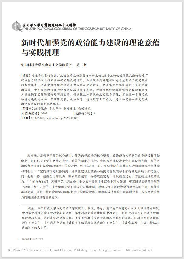 《人民論壇·學(xué)術(shù)前沿》 2023年第2期(1月下)刊發(fā)了我院岳奎教授的學(xué)術(shù)論文《新時代加強(qiáng)黨的政治能力建設(shè)的理論意蘊(yùn)與實踐機(jī)理》。