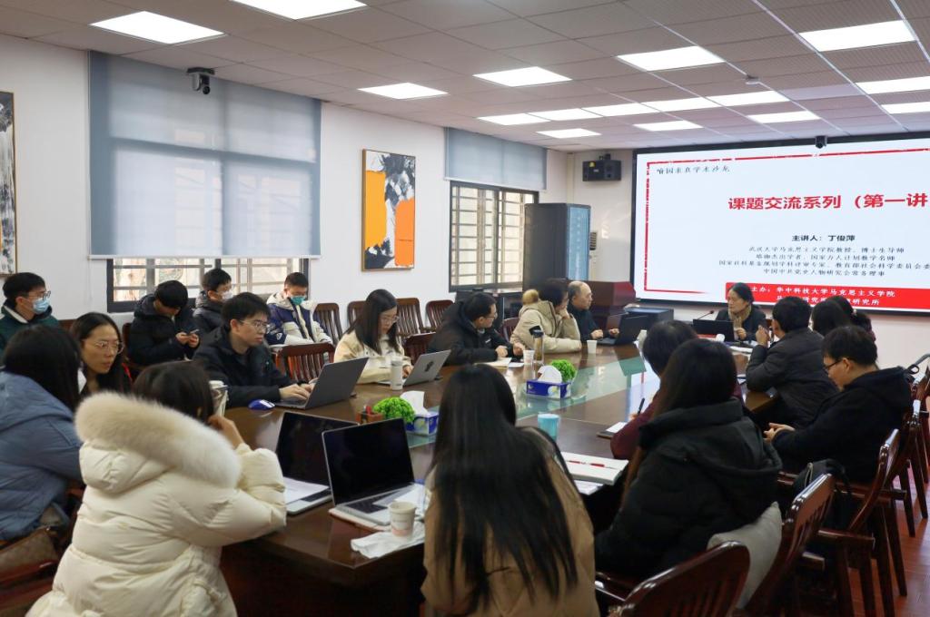 (通訊員:鄢楚)1月9日上午,喻園求真學(xué)術(shù)沙龍——課題交流系列第一講在東七樓203會議室順利開講。武漢大學(xué)馬克思主義學(xué)院教授、博士生導(dǎo)師、珞珈杰出學(xué)者、國家社科基金規(guī)劃學(xué)科評審專家、教育部社會科學(xué)委員會委員、中國中共黨史人物研究會常務(wù)理事丁俊萍應(yīng)邀為我院師生作課題交流指導(dǎo)。我院馬克思主義中國化研究所所長、教授文紅玉主持本次學(xué)術(shù)沙龍,我院部分青年教師、碩博生參加交流。