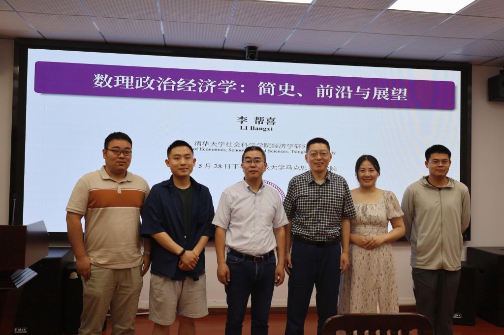 (通訊員:楊皓若)5月28日上午,由華中科技大學(xué)馬克思主義基本原理研究所、馬克思主義基本原理教研室主辦的“馬克思與現(xiàn)代社會(huì)”系列學(xué)術(shù)活動(dòng)第二期于東七樓203會(huì)議室順利舉辦。清華大學(xué)社會(huì)科學(xué)學(xué)院經(jīng)濟(jì)學(xué)研究所(長(zhǎng)聘)副教授、副所長(zhǎng)、博士生導(dǎo)師李幫喜老師受邀,做題為“數(shù)理政治經(jīng)濟(jì)學(xué):簡(jiǎn)史、前沿與展望”的學(xué)術(shù)講座。馬克思主義學(xué)院師生代表參加本次學(xué)術(shù)活動(dòng)。活動(dòng)由馬克思主義基本原理教研室楊成林老師主持。