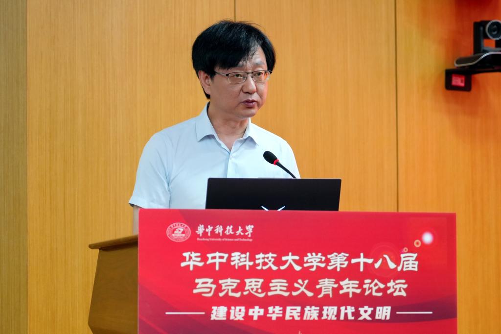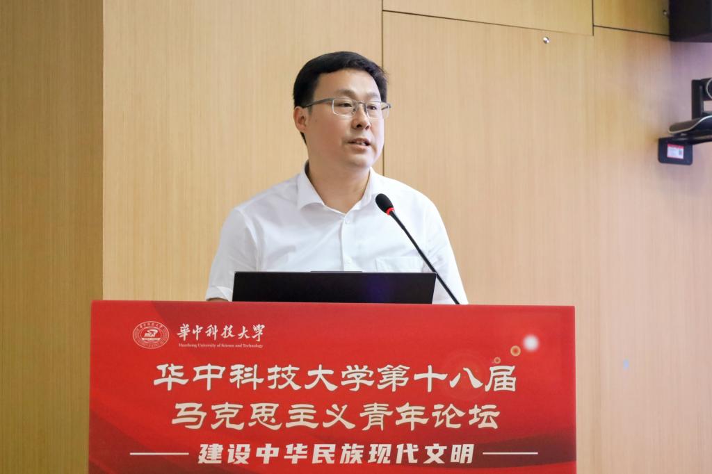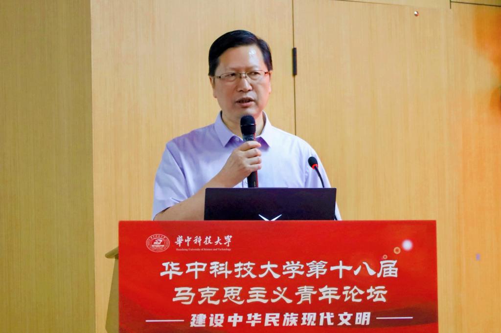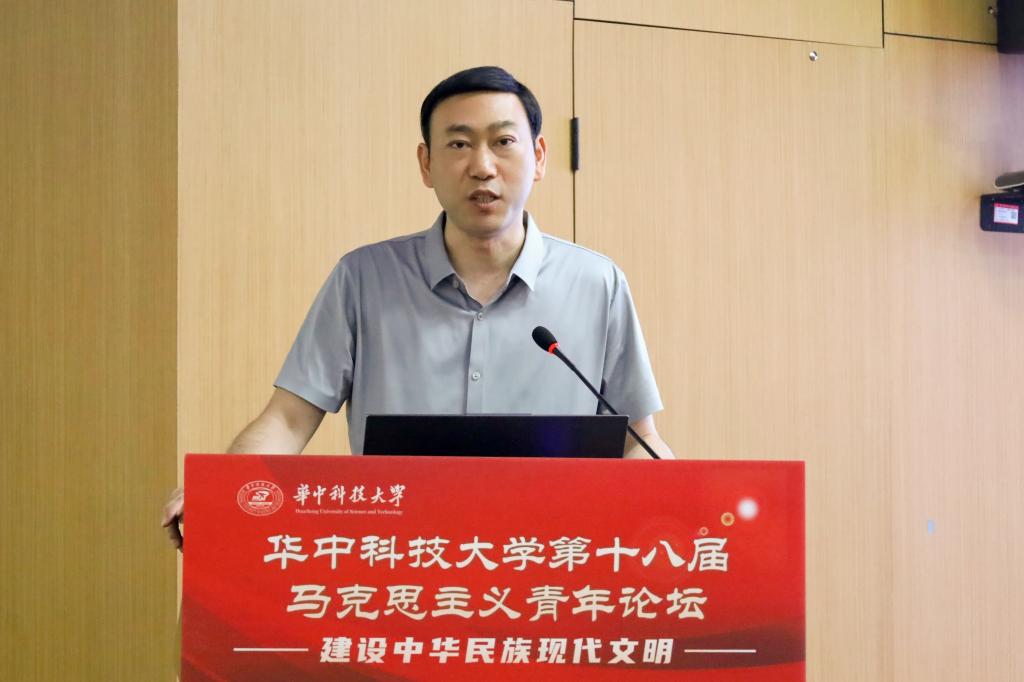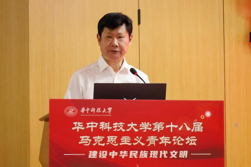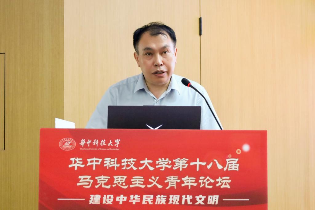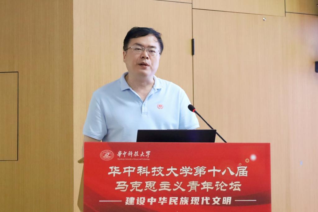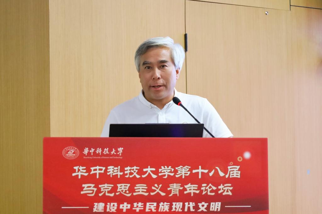 (通訊員:徐薇 楊夢(mèng)楠)6月15日,由華中科技大學(xué)黨委宣傳部、共青團(tuán)華中科技大學(xué)委員會(huì)、華中科技大學(xué)馬克思主義學(xué)院、華中科技大學(xué)馬克思主義研究院、湖北省高校青年工作研究會(huì)、湖北省中國(guó)特色社會(huì)主義理論體系研究中心華中科技大學(xué)分中心共同舉辦的華中科技大學(xué)第十八屆馬克思主義青年論壇在八號(hào)樓求實(shí)報(bào)告廳順利舉辦。來自我校和北京大學(xué)、武漢大學(xué)、吉林大學(xué)等多所高校和研究機(jī)構(gòu)的專家學(xué)者、青年學(xué)子共聚一堂,共同為中華民族現(xiàn)代文明和社會(huì)主義文化強(qiáng)國(guó)建設(shè)貢獻(xiàn)智慧。湖北省社科聯(lián)第九屆委員會(huì)主席、教授趙凌云,湖北省人大常委、人大教科文衛(wèi)委員會(huì)副主任喻立平,華中科技大學(xué)黨委副書記謝正學(xué),黨委宣傳部常務(wù)副部長(zhǎng)詹健,團(tuán)委書記羅迪,人文社會(huì)科學(xué)處副處長(zhǎng)童文勝,馬克思主義學(xué)院黨委書記王學(xué)東,院長(zhǎng)岳奎,黨委副書記、副院長(zhǎng)王明飛,馬克思主義研究院副院長(zhǎng)梁浩偉以及來自全國(guó)各地高校的專家學(xué)者、青年學(xué)子共同參與此次會(huì)議。