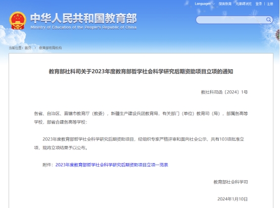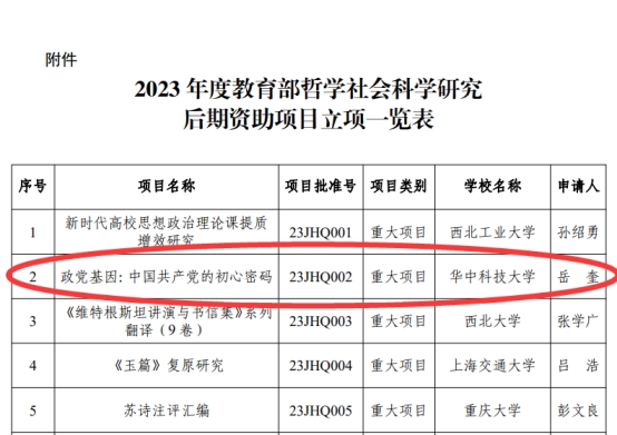 近日,全國哲學(xué)社會科學(xué)工作辦公室公布了2023年度教育部哲學(xué)社會科學(xué)研究后期資助項目立項名單,我院岳奎教授獲得重大項目立項資助。