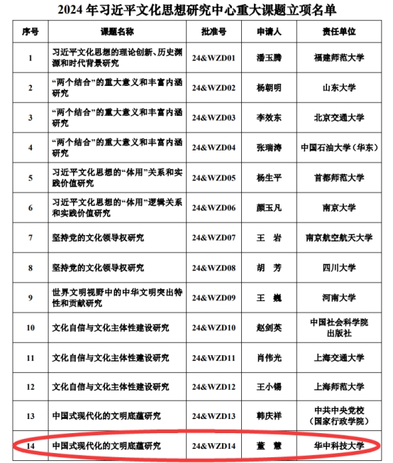 近日,全國(guó)哲學(xué)社會(huì)科學(xué)工作辦公室公布了2024年習(xí)近平文化思想研究中心重大課題立項(xiàng)名單,我院董慧教授獲得立項(xiàng)資助。