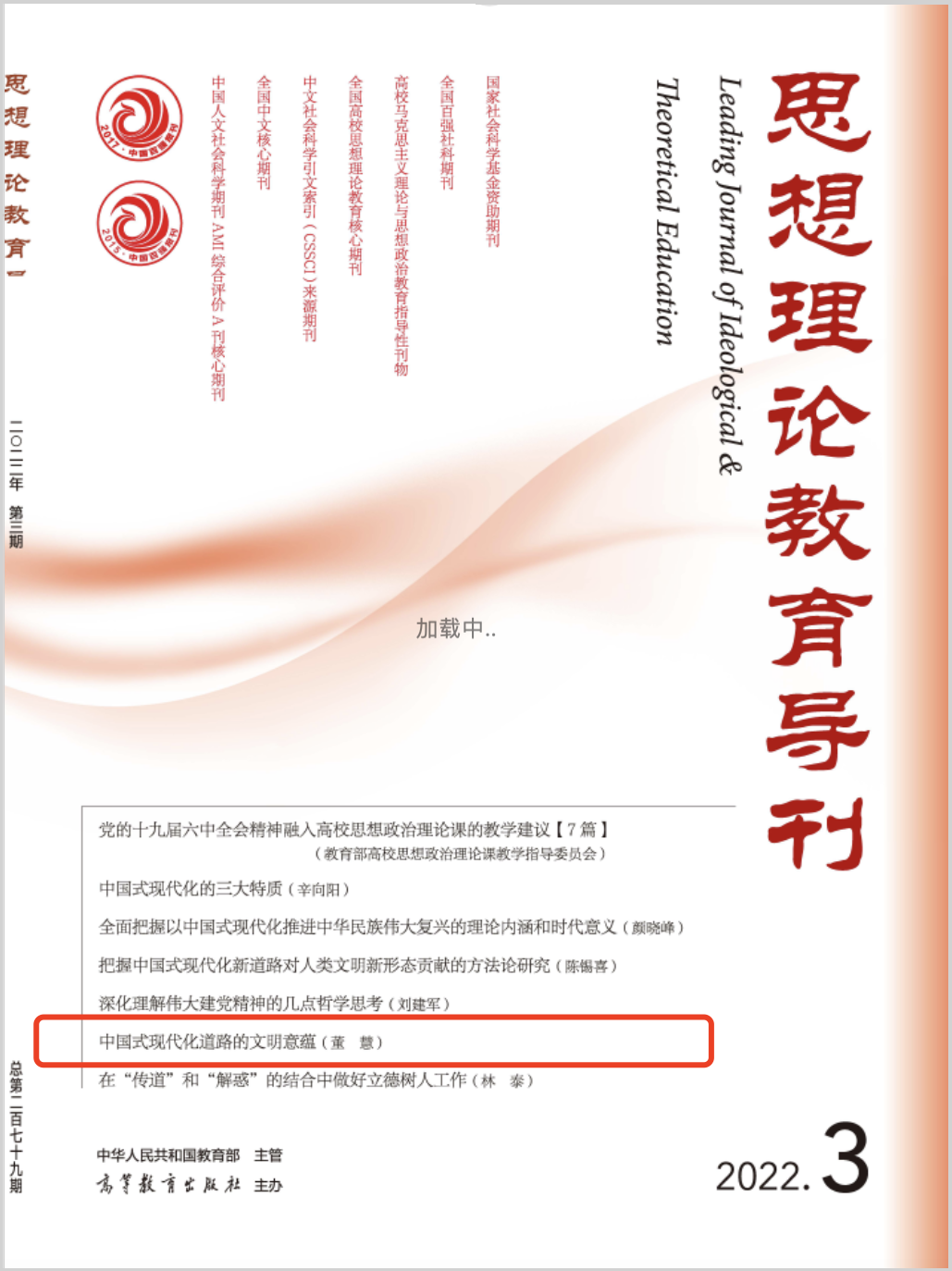 《思想理論教育導(dǎo)刊》2022年第3期封面重點(diǎn)文章刊發(fā)我院董慧教授學(xué)術(shù)論文《中國式現(xiàn)代化道路的文明意蘊(yùn)》。該文系2021年度教育部哲學(xué)社會科學(xué)研究重大課題攻關(guān)項(xiàng)目“中國共產(chǎn)黨領(lǐng)導(dǎo)下中國現(xiàn)代化道路探索歷程與經(jīng)驗(yàn)研究”的階段性成果。