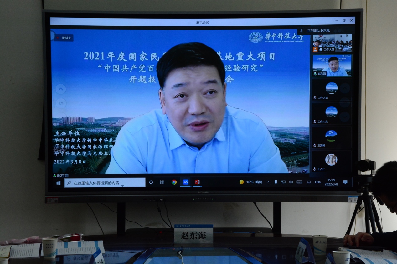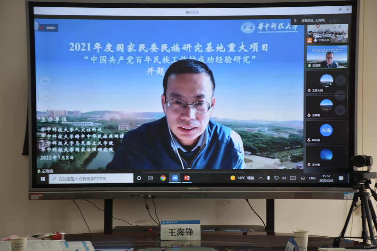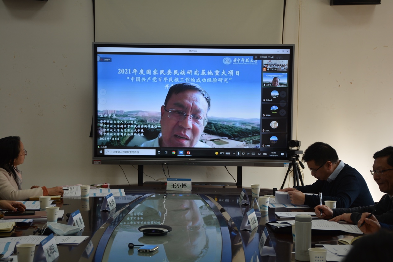 3月8日下午,由華中科技大學(xué)馬克思主義學(xué)院馬克思主義基本原理研究所、華中科技大學(xué)國家治理研究院、華中科技大學(xué)鑄牢中華民族共同體意識研究基地承擔(dān)的2021年度國家民委民族研究基地重大項目“中國共產(chǎn)黨百年民族工作的成功經(jīng)驗研究”在華中科技大學(xué)東五樓會議室舉行開題報告會。來自國家民族事務(wù)委員會協(xié)調(diào)推進司智庫處、中共中央黨校(國家行政學(xué)院)、中央民族大學(xué)、內(nèi)蒙古民族大學(xué)、新疆大學(xué)、西藏民族大學(xué)等單位的專家參與此次會議。