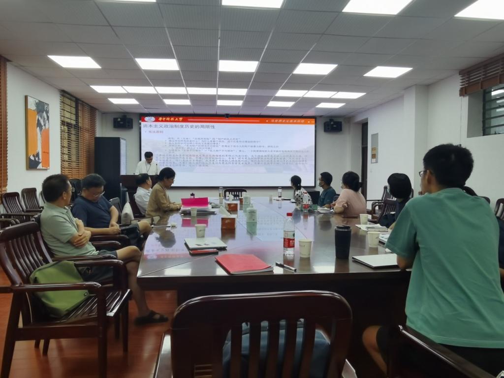 課程組各位老師重點討論了如何更好地運用平時成績增強課堂教學效果,如何更科學、更規(guī)范地記錄平時成績等問題。張峰老師結(jié)合自身的教學經(jīng)驗,給大家提出了很好的意見和建議。課程組各位老師在這個問題上取得了一致共識。隨后,新進青年教師夏語博士就“什么是馬克思主義的科學性及如何講好馬克思主義的科學性”向與會各位老師請教。張峰老師從世界觀和方法論的角度對馬克思主義的科學性進行了系統(tǒng)講解;熊文嫻老師則側(cè)重于從科學技術(shù)哲學的角度進行了深入分析。