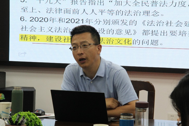 會(huì)上,李志強(qiáng)結(jié)合黨的二十大報(bào)告內(nèi)容,對(duì)“德法”教材法治部分的教學(xué)設(shè)計(jì)展開(kāi)論述,重點(diǎn)圍繞社會(huì)主義法治精神,就其提出的歷程、演繹邏輯、內(nèi)涵外延和具體內(nèi)容進(jìn)行了深入淺出的講解。他從二十個(gè)問(wèn)題入手,對(duì)“弘揚(yáng)社會(huì)主義法治精神”這一議題在教學(xué)過(guò)程中的具體設(shè)計(jì)進(jìn)行了逐一演示和分析,為大家?guī)?lái)了一堂生動(dòng)精彩的演說(shuō)課。