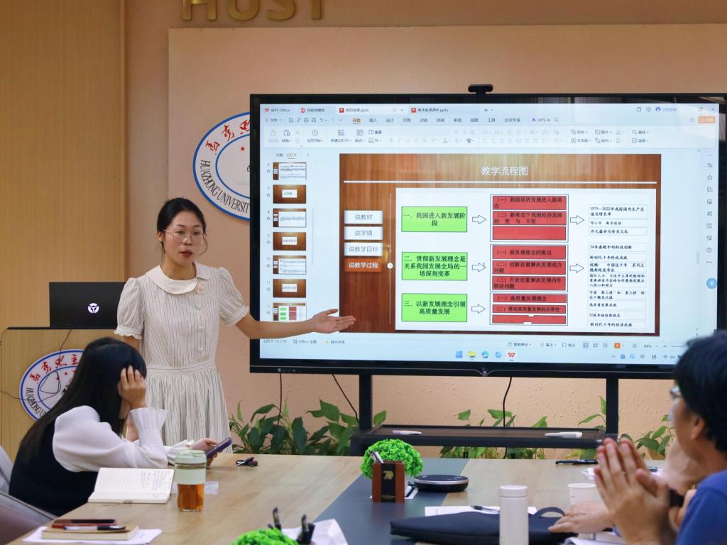 隨后,備課會進(jìn)入青年教師說課環(huán)節(jié)。劉榮琴以推動高質(zhì)量發(fā)展為主題展開說課,她從教材、學(xué)情、教學(xué)目標(biāo)、教學(xué)過程四個方面分析了該節(jié)內(nèi)容的教學(xué)重難點(diǎn),并依此提出了具體應(yīng)對措施,以便幫助學(xué)生深刻理解該節(jié)內(nèi)容的理論意義及現(xiàn)實(shí)價(jià)值。