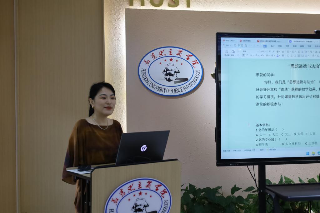 隨后第二個環(huán)節(jié),張冬靜向與會教師詳細介紹了以O(shè)BE理念為基礎(chǔ)的學情調(diào)研問卷編制與修訂情況。張冬靜指出,問卷通過設(shè)計多種類型的題目,旨在全面了解學生的學習情況和對思政課程的反饋,由此評估學生對課程知識的掌握程度,了解教學效果。問卷結(jié)果也將為教師們不斷改進教學方式、化教學內(nèi)容提供了參考意見。