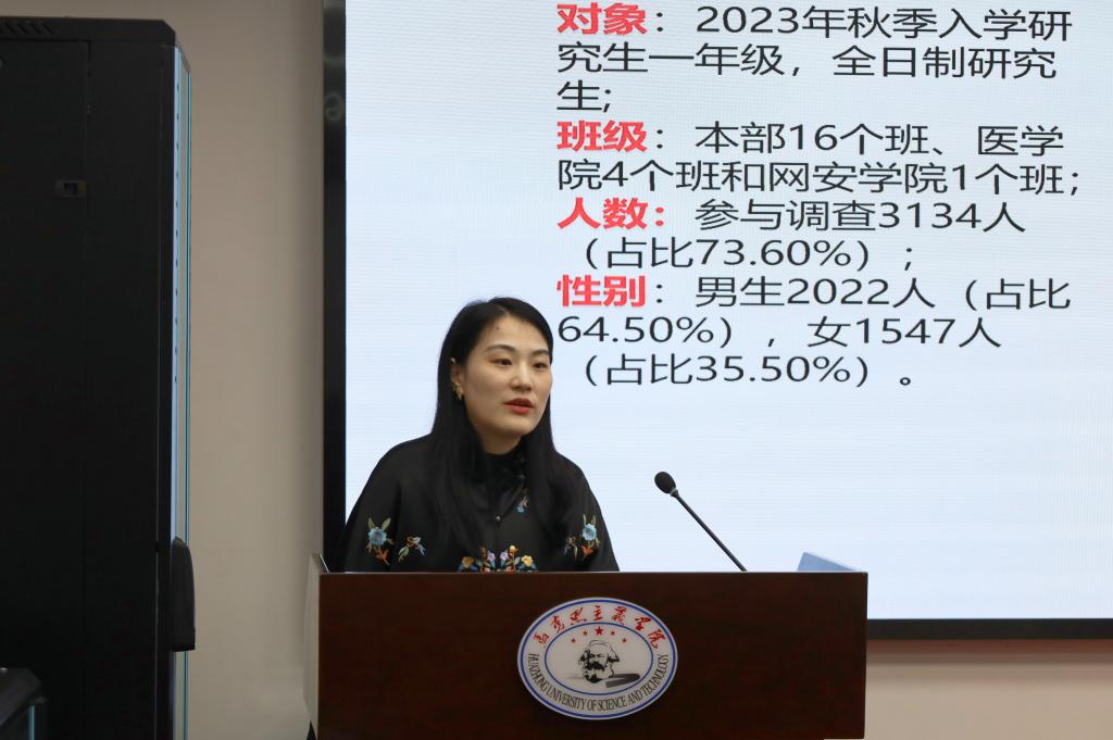 首先,由張冬靜介紹了中特課堂2023級(jí)研究生課程滿意度問(wèn)卷調(diào)查結(jié)果。她分別從調(diào)查反饋的課堂整體印象、授課準(zhǔn)備、教學(xué)方法、教學(xué)內(nèi)容、教學(xué)管理和教學(xué)效果評(píng)估六個(gè)方面分析了同學(xué)們對(duì)課堂的看法。總體來(lái)看,學(xué)生對(duì)中特課程的整體滿意度和印象較好,在老師們的共同努力下學(xué)生課程滿意度持續(xù)提升,特別是在教學(xué)準(zhǔn)備、教學(xué)方式、教學(xué)管理和教學(xué)效果這四個(gè)方面,學(xué)生滿意度較2022年進(jìn)一步提升。中特課程教師團(tuán)隊(duì)采用的專題授課方式得到99%以上同學(xué)的認(rèn)可,教師們公平合理的教學(xué)評(píng)分也受到學(xué)生的高度贊同。在課程互動(dòng)中,老師們對(duì)學(xué)生主動(dòng)發(fā)言的肯定和鼓勵(lì)也讓學(xué)生們深深感受到老師對(duì)學(xué)生的尊重和贊賞,學(xué)生課堂積極性明顯提升。通過(guò)這六個(gè)方面的分析,張冬靜向教研室老師們展示了學(xué)生們對(duì)中特課程的真實(shí)看法和反饋。這些良好反饋體現(xiàn)了教研室老師們對(duì)教學(xué)質(zhì)量的關(guān)注和對(duì)學(xué)生認(rèn)真負(fù)責(zé)的態(tài)度,學(xué)生們?cè)趩?wèn)卷中提出的建議也為教師們提供了寶貴的參考,有助于改進(jìn)教學(xué)方法、提高教學(xué)質(zhì)量。