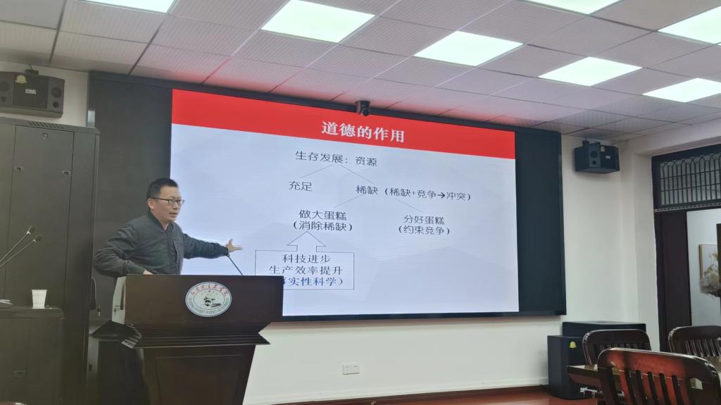在章節(jié)磨課環(huán)節(jié)中,張蕾和阮麗萍就德法教材法治部分的教學(xué)設(shè)計(jì)分別展開論述,并對教學(xué)過程中的具體細(xì)節(jié)逐一進(jìn)行了分享。接著,趙志堅(jiān)針對德法教材第五章進(jìn)行說課展示。他以思想實(shí)驗(yàn)為課程引入點(diǎn),就道德的本質(zhì)及作用進(jìn)行了深入淺出的講解,為大家?guī)硪惶蒙鷦?dòng)精彩的演說課。