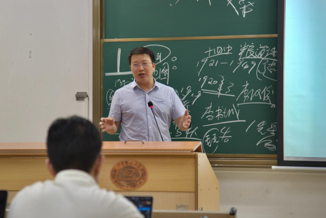 課程伊始,岳奎以大別山地理位置為切入點,生動地講述了大別山革命的歷史進(jìn)程以及早期馬克思主義思想在該地的傳播演變。他從歷史的視角出發(fā),詳細(xì)介紹了董必武、惲代英等黨的早期革命活動價傳播馬克思主義思想的重要活動和時期;詳細(xì)講述陳獨秀、董必武、陳譚秋等早期共產(chǎn)黨人的建黨活動與李先念等革命先輩的戰(zhàn)斗事跡,詳細(xì)講解了大別山區(qū)革命先輩依托武漢、皖西和豫南的革命活動中心開展“火種”的傳播工作以及為中國共產(chǎn)黨的創(chuàng)建做出的重大貢獻(xiàn);武漢中學(xué)對革命人才的培養(yǎng)工作和共存社開展的革命活動。他強(qiáng)調(diào),作為華科大的優(yōu)秀學(xué)子,同學(xué)們應(yīng)在學(xué)好專業(yè)知識的同時了解大別山革命歷史,弘揚大別山精神,樹立家國情懷,以天下為己任,守好中國共產(chǎn)黨人的精神信仰。