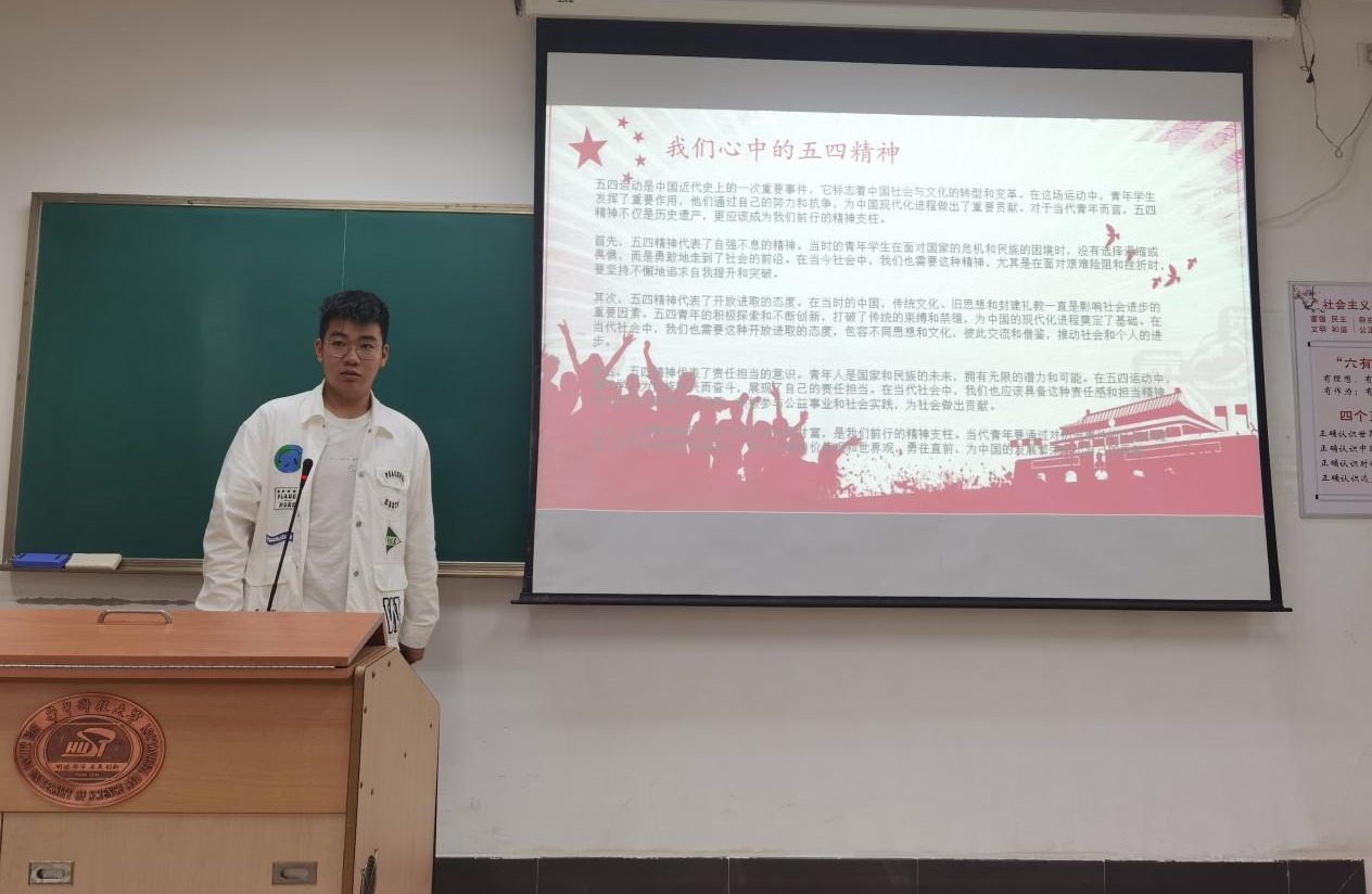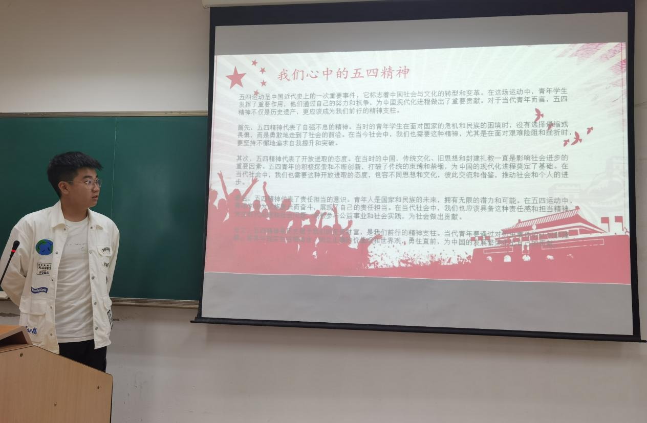 以五四精神的內(nèi)涵與傳承、五四運(yùn)動(dòng)中的歷史人物和當(dāng)代杰出青年代表等為切入點(diǎn),同學(xué)們?cè)谧龊们捌谫Y料搜集、小組研討和問(wèn)卷調(diào)查等工作的基礎(chǔ)上,采用視頻或演講等形式進(jìn)行課堂交流匯報(bào),他們生動(dòng)詮釋了以愛(ài)國(guó)、進(jìn)步、民主、科學(xué)為核心的五四精神的內(nèi)涵與意義。