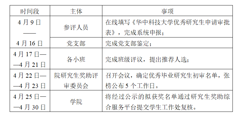 1.3月28日-4月20日,院系評選細則公布給全體畢業(yè)生,并嚴格按照評選條件和要求組織評選。由學生本人在“研究生獎助綜合服務平臺”http://yjsjz.hust.edu.cn/web/home/index/中在線填寫《華中科技大學優(yōu)秀研究生申請審批表》,線下須按照研究生守則由黨支部或班委會對畢業(yè)生進行畢業(yè)鑒定,鑒定通過者,結合鑒定情況和歷年表現(xiàn),研究生導師、輔導員和院系副書記逐級進行在線審核。