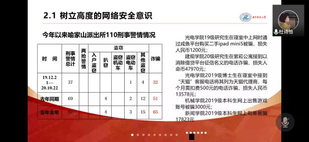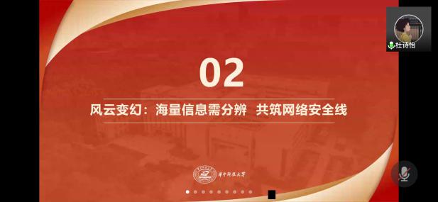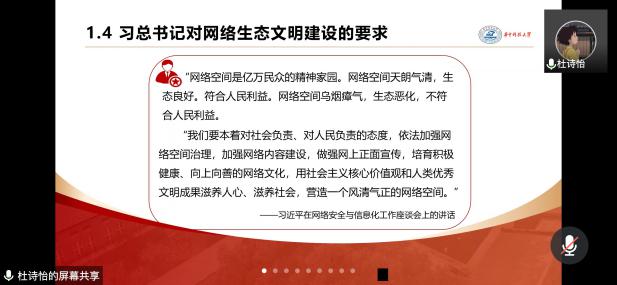 在微黨課環(huán)節(jié)中,杜詩怡同志以《同塑網絡生態(tài),共建網絡文明》為題為大家?guī)砹艘惶脙热莩鋵嵍稚羁痰奈Ⅻh課。她首先以十九屆五中全會對網絡生態(tài)文明建設的要求談道“加強網絡文明建設,發(fā)展積極健康的網絡文化”建設具有中國特色的網絡文明是我們面臨的重要任務;此外,她以發(fā)生在我們身邊的、真實的事件、社會熱點話題——近幾個月一些院系學生的網絡受騙事件、“清華學姐”事件等為案例,告誡青年黨員要學會分辨海量信息,樹立高度的網絡安全意識,文明上網,理性發(fā)聲;最后,強調作為時代先鋒,我們應爭做網絡新青年,共筑網絡新生態(tài)。