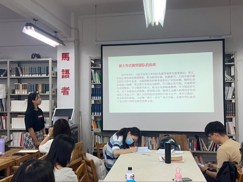 隨后,尚瀟雨同志介紹了黃大年式教學(xué)團隊的由來和含義,以及習(xí)近平給全國高校黃大年式教育團隊代表的回信。4年多來,全國高校黃大年式教師團隊創(chuàng)建成效顯著、影響廣泛。在第37個教師節(jié)前夕,習(xí)近平總書記給全國高校黃大年式教師團隊代表回信,對他們寄予殷切期望,并向全國廣大教師致以節(jié)日的祝賀和誠摯的祝福。在回信中,習(xí)總書記既提出了“好老師”的標(biāo)準(zhǔn)和方向,又明確了成為“好老師”的路徑和方法,充分體現(xiàn)了黨中央對廣大教育工作者的重視關(guān)心、重托期待。由榜樣推向集體,大家學(xué)習(xí)了“黃大年式教師團隊”的精神,以李加納教授“油菜教師團隊”為例,黃大年精神在他們的身上熠熠閃光。