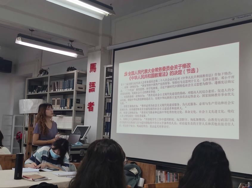 接下來,曲夢璐同志為大家介紹了《中華人民共和國教育法》的修改內(nèi)容,以及習(xí)近平總書記關(guān)于教育的重要論述。特別提到,2018年5月2日,習(xí)近平總書記在北京大學(xué)師生座談會上指出,“馬克思主義是我們立黨立國的根本指導(dǎo)思想,也是我國大學(xué)最鮮亮的底色”。習(xí)近平總書記關(guān)于教育的重要論述,內(nèi)涵十分豐富,貫通其中的“道路自信”、“理論自信”、“制度自信”、“文化自信”,對于培養(yǎng)中國特色社會主義事業(yè)建設(shè)和接班人,具有十分重要的理論和現(xiàn)實意義。