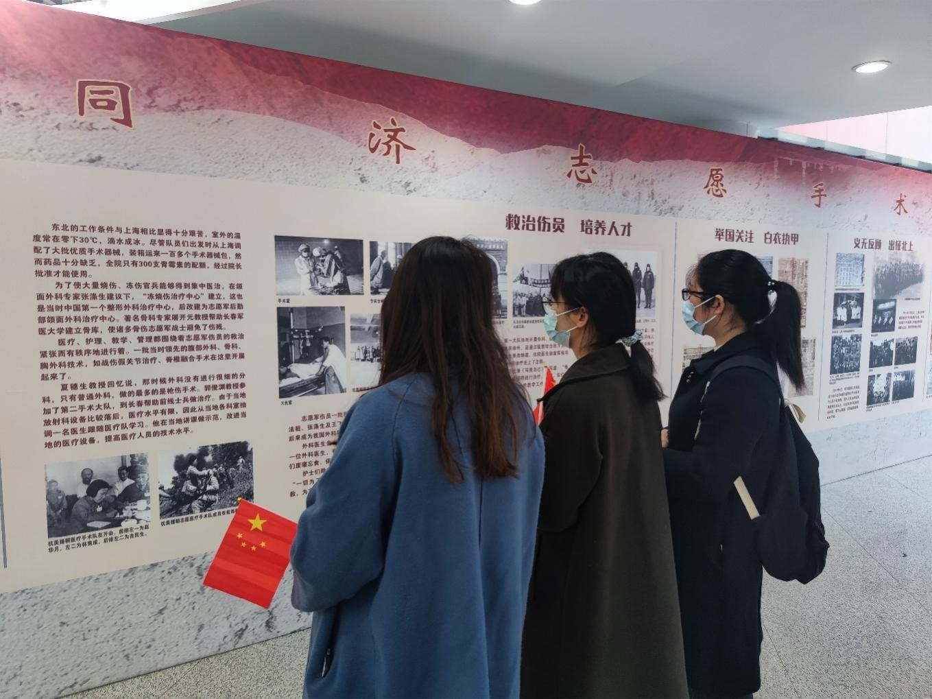 院黨委書記李小紅、副書記王明飛與師生一同參觀學(xué)習(xí)。在展覽中,同學(xué)們了解到,當(dāng)時(shí)東北的工作條件十分艱辛,醫(yī)療條件落后。同濟(jì)醫(yī)學(xué)院及附屬同濟(jì)醫(yī)院、附屬協(xié)和醫(yī)院師生參加“抗美援朝”志愿醫(yī)療隊(duì)臨危不懼、逆向前行,奔赴前線的先進(jìn)事跡十分令人動(dòng)容。一個(gè)個(gè)生動(dòng)感人的案例,一張張直擊心靈的照片,都用文字和圖片發(fā)揮著偉大抗美援朝精神的巨大思想政治教育作用。