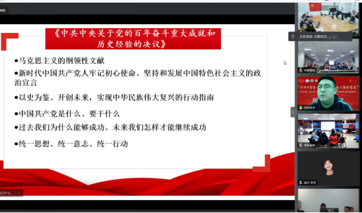 為深入學(xué)習(xí)貫徹黨的十九屆六中全會(huì)精神,學(xué)懂弄通悟透《中共中央關(guān)于黨的百年奮斗重大成就和歷史經(jīng)驗(yàn)的決議》,以黨的十九屆六中全會(huì)精神學(xué)習(xí)為主線,落實(shí)總書記關(guān)于“黨史學(xué)習(xí)教育”的重要指示,深化“不忘初心,牢記使命”主題教育成果,大力發(fā)揚(yáng)紅色傳統(tǒng)、傳承紅色基因。2021年12月27日下午,華中科技大學(xué)、北京師范大學(xué)、南開大學(xué)三校馬克思主義學(xué)院研究生黨支部以線上線下相結(jié)合的方式開展了以“共講共學(xué)全會(huì)精神,請(qǐng)黨放心強(qiáng)國(guó)有我”為主題的十九屆六中全會(huì)精神聯(lián)合專題宣講會(huì)。