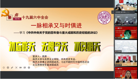 在黨史學(xué)習(xí)教育宣講會(huì)環(huán)節(jié),來(lái)自華中科技大學(xué)、北京師范大學(xué)、南開大學(xué)三校的三名宣講員依次呈現(xiàn)了三場(chǎng)精彩生動(dòng)的十九屆六中全會(huì)精神分主題宣講。