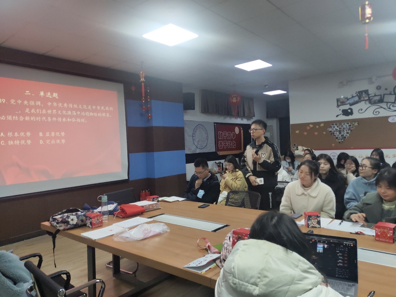 隨后,支部根據(jù)以上文件內(nèi)容,以隨機(jī)抽簽的形式開展了趣味知識競答活動,與會同學(xué)在閱讀后通過答題測驗進(jìn)一步鞏固學(xué)習(xí)成果。為了調(diào)動大家的積極性,提升支部活動的豐富性,支部成員共同玩起了“擊鼓傳花”的小游戲,接到“花”的同學(xué)結(jié)合近期選題研究分享了個人的學(xué)習(xí)心得,從中國農(nóng)村女性形象的變遷,到鄉(xiāng)村振興與治理,再到人類命運共同體,大家在暢聊研究選題的同時,聯(lián)系主題黨日的學(xué)習(xí)體會,將黨的理論轉(zhuǎn)化為武裝頭腦、指導(dǎo)實踐、推動學(xué)習(xí)的正能量,有效促進(jìn)了學(xué)習(xí)教育入腦入心。