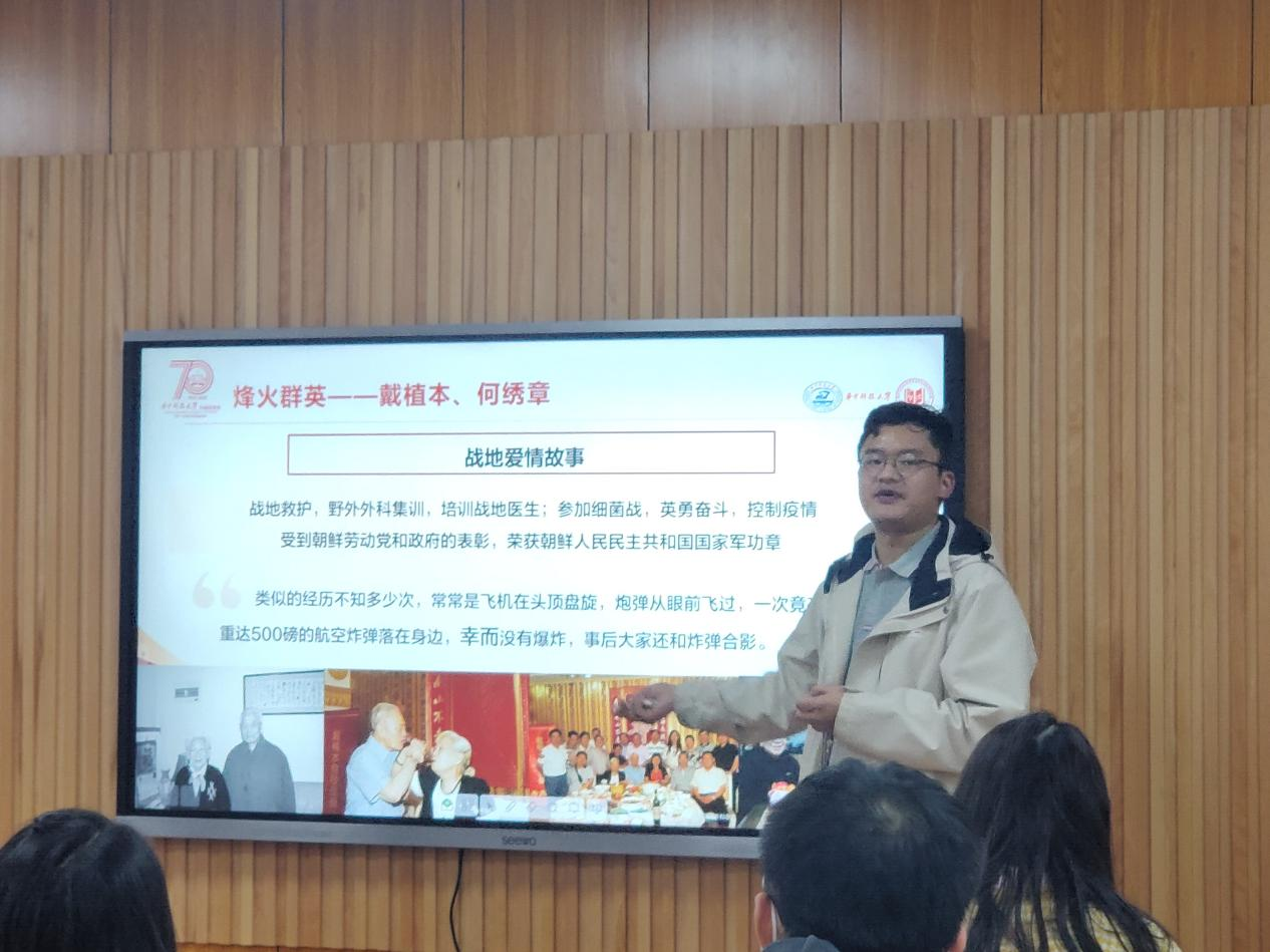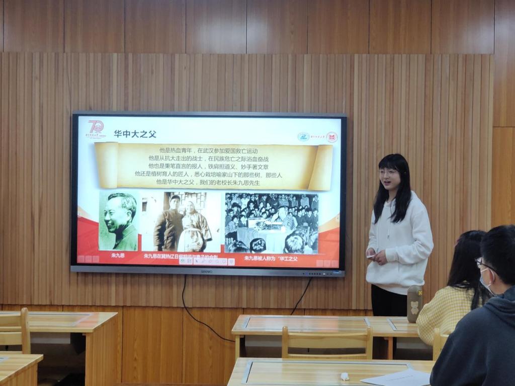 為講好黨史校史故事,傳承華中大的紅色基因,激發(fā)同學(xué)們的愛校榮校之情,支部成員汪建輝和賈露雅分別為大家講述了“抗美援朝中的華中大”和“華工之父”朱九思的故事。